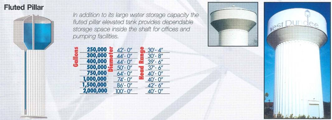 Fluted pillar elevated tanks provide space within the fluted shaft for offices, storage, pump equipment, and more, as well as extensive water storage capacity. Available sizes include