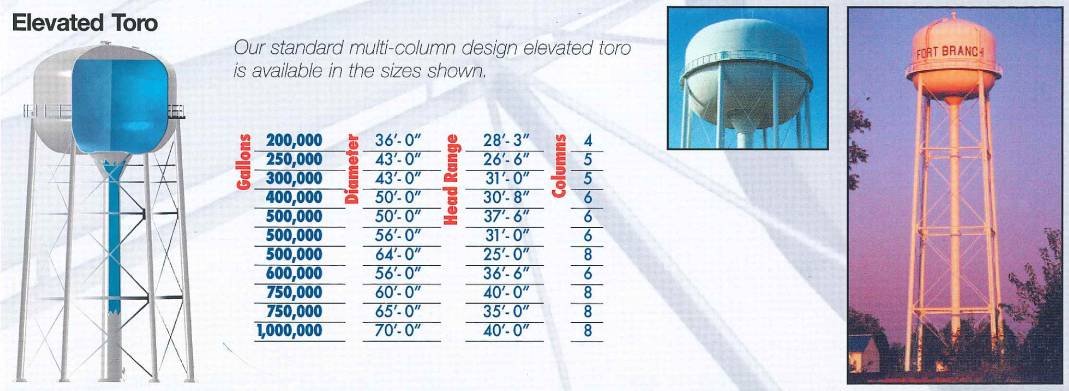 Elevated toro storage tanks are named for their torispherical tank design. These tanks are commonly used for particularly high pressure applications. Our elevated toro tanks are designed in a variety of sizes and column options