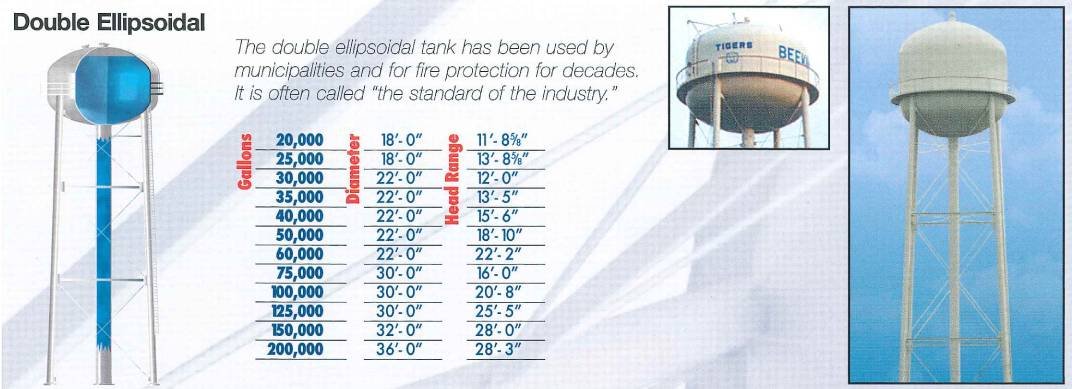 Constructed of a cylindrical side wall welded to an ellipsoid top and bottom and supported by steel beams and columns, double ellipsoidal storage tanks are often considered to be the standard tank style. At Pittsburg Tank & Tower, we offer the following double ellipsoidal storage tank sizes