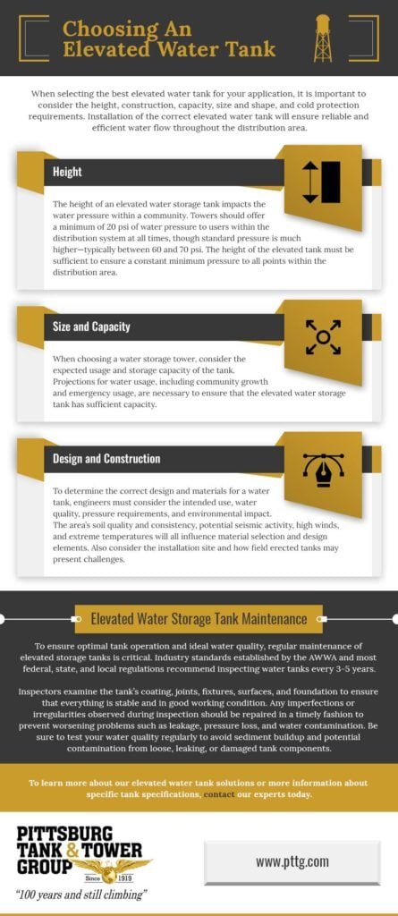 To determine the correct design and materials for a job, elevated water tank contractors must consider the intended use, water quality, pressure requirements, and environmental impact. The area’s soil quality and consistency, potential seismic activity, high winds, and extreme temperatures will all influence material selection and design elements. Also consider the installation site and how field erected tanks may present challenges.